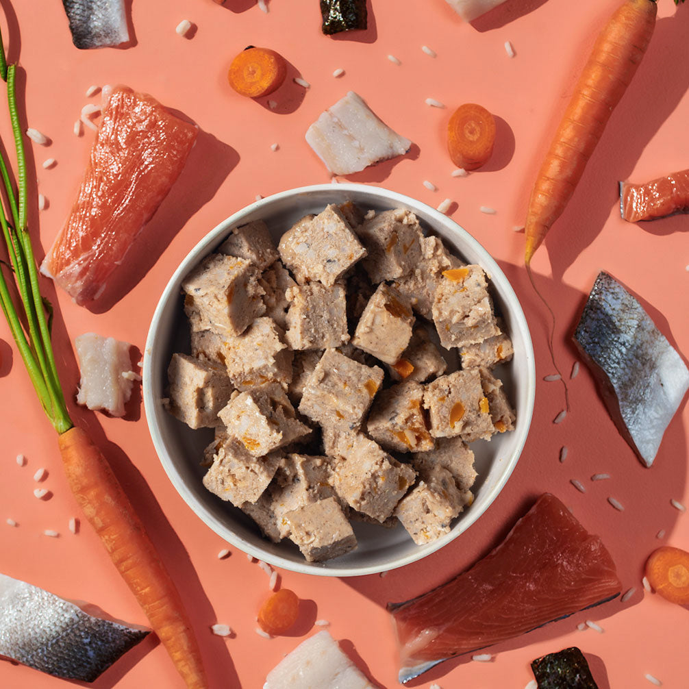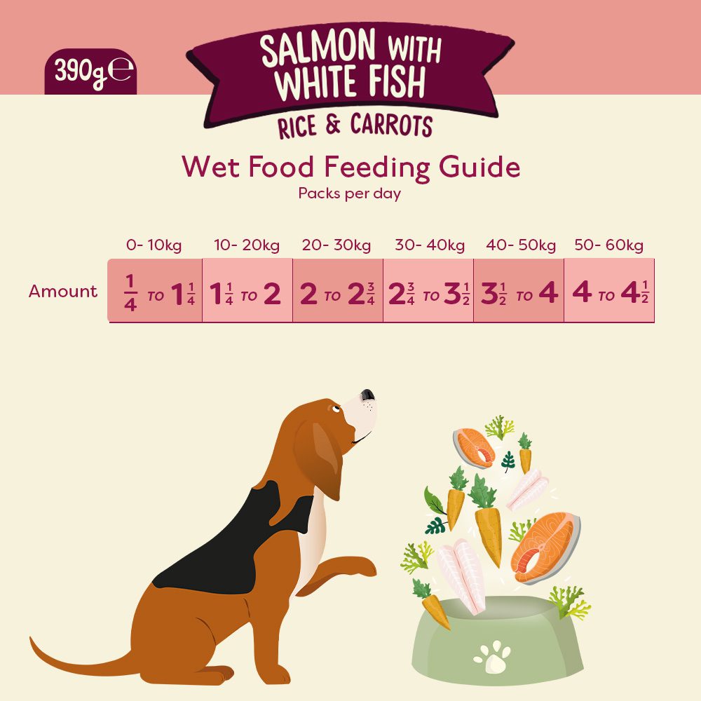 A complete and balanced Salmon & White Fish recipe with rice and carrots to nourish adult dogs.